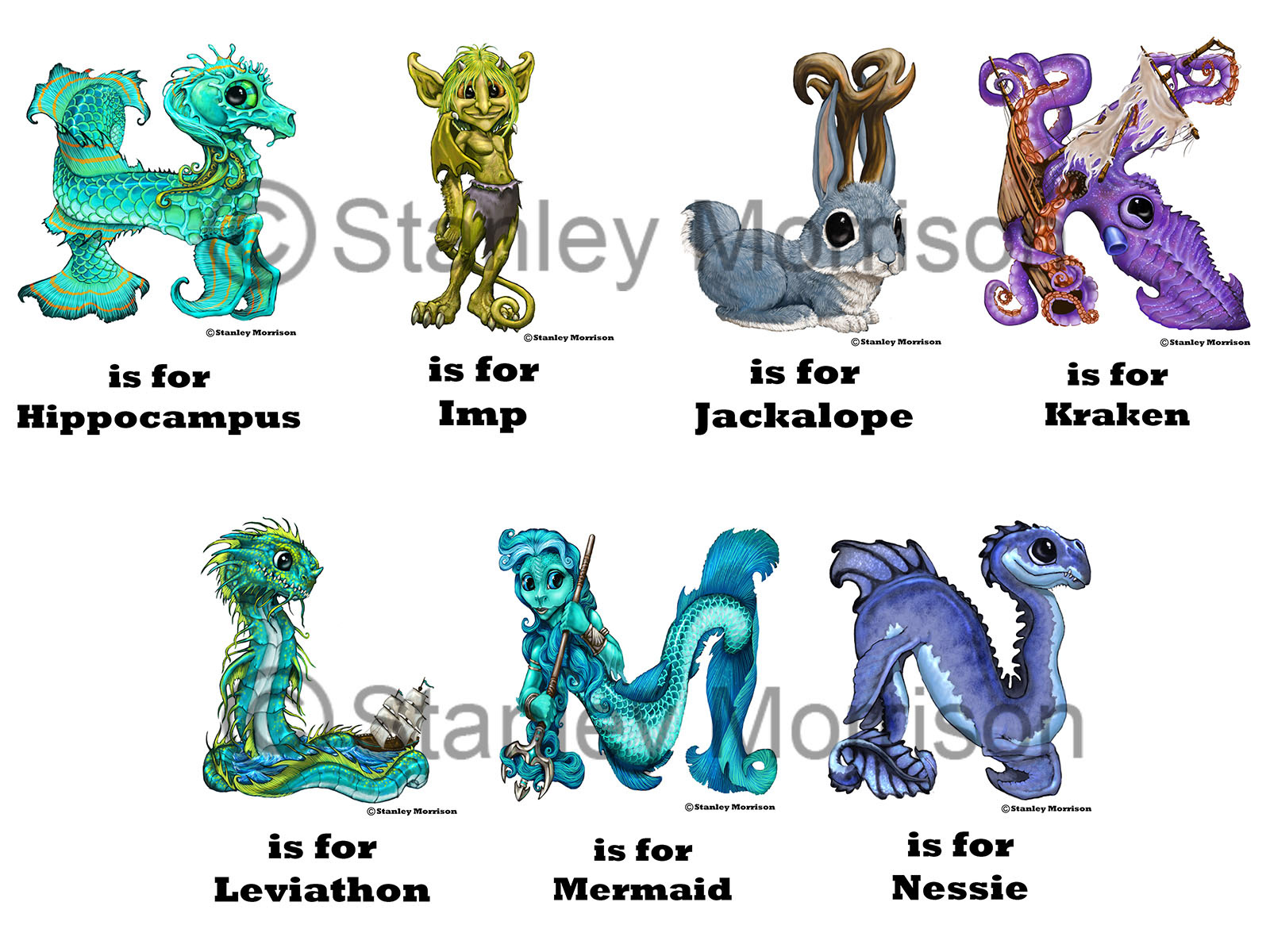 Alphabet letters done with mythical creatures in the shape of the letters.